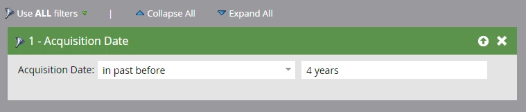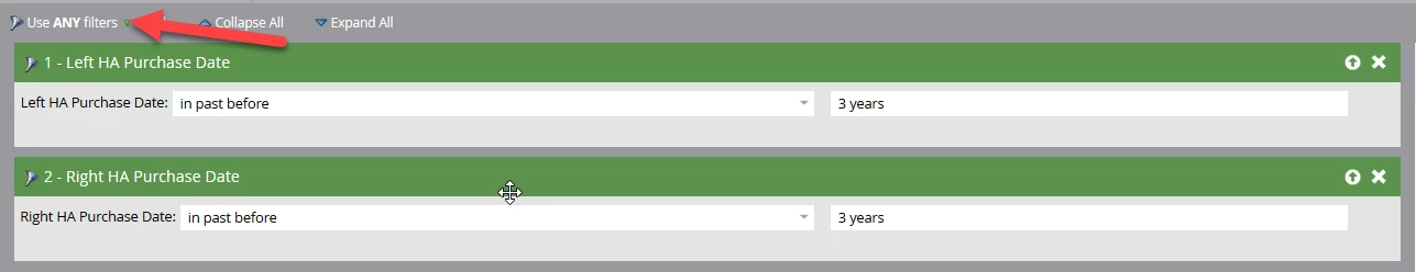 For your Left / Right purchase dates, here's how I would set this up. Make sure you change the filter choice at the top to be "ANY," which means if EITHER their left purchase date OR their right purchase date is on or before 3 years ago they will qualify. If you leave it as "AND" BOTH left AND right would have to be 3+ years to qualify. I'm assuming you want either or. This is your entire smart list.