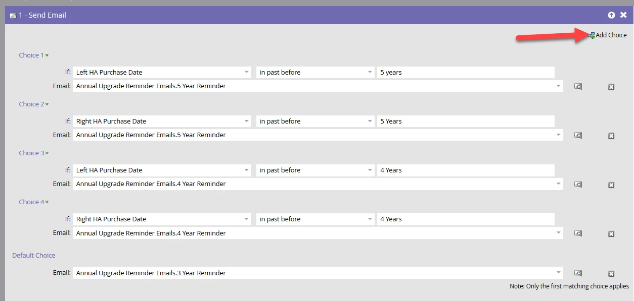 3) Send an email. Which email it sent is based on how far in the past the customer's purchase date is (5, 4 or 3 years)