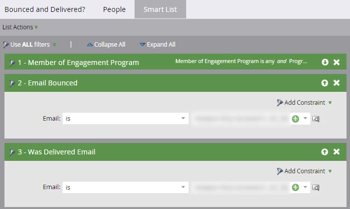 - A Smart list saying "Was Delivered Email" AND "Email Bounced" has results