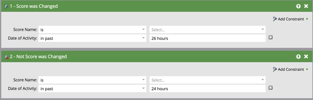 Instead of waiting a day, can I trigger on score changes that happened 24 hours in the past (or 24-25 hours in the past)? The issue with the wait step is that if I only allow people to enter the campaign once or every ___ days, I have a bunch of people who enter the campaign, then get removed from it before I send them any email. If I can avoid the initial wait step, I'll guarantee that everybody in the drip campaign gets at least the first email.