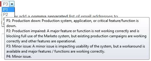 When I enter a support ticket I can A) Never remember what the different Ps stand for B) don't know where to go look for the definition. It would be nice if there was some kind of permanent key that is a reminder for the different levels of severity or, better yet, rename it so that P3=Minor and so on.