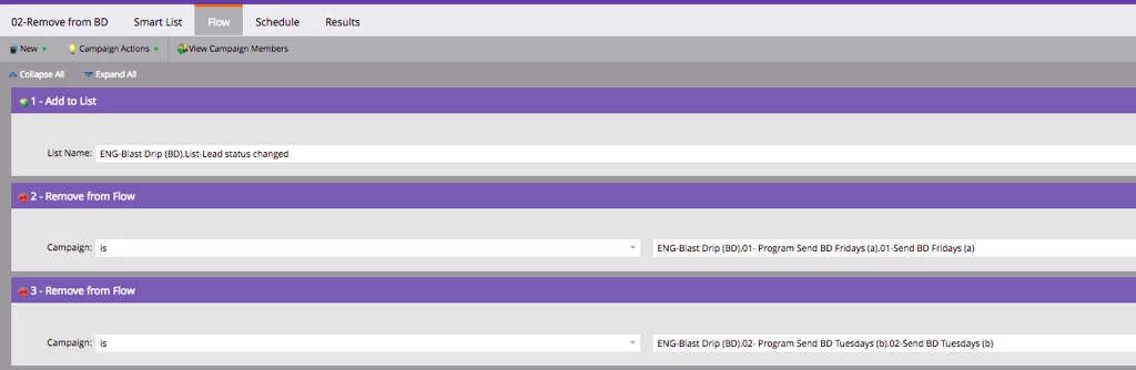 So if a lead is converted in the middle of the email drip, it gets pulled out, so I have a separate smart campaign that handles remove from above flow: