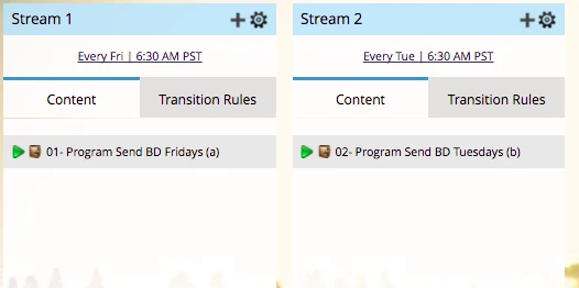 Two programs under nurture stream program: one handles Friday sends, and another one handles Tuesday sends.