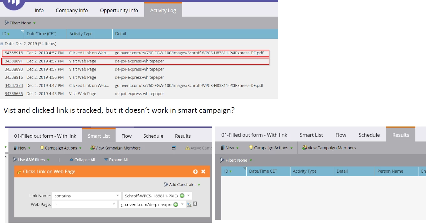 You can see in the image below, that Marketo has tracked the activity, but the smart campaign trigger didn't fire.