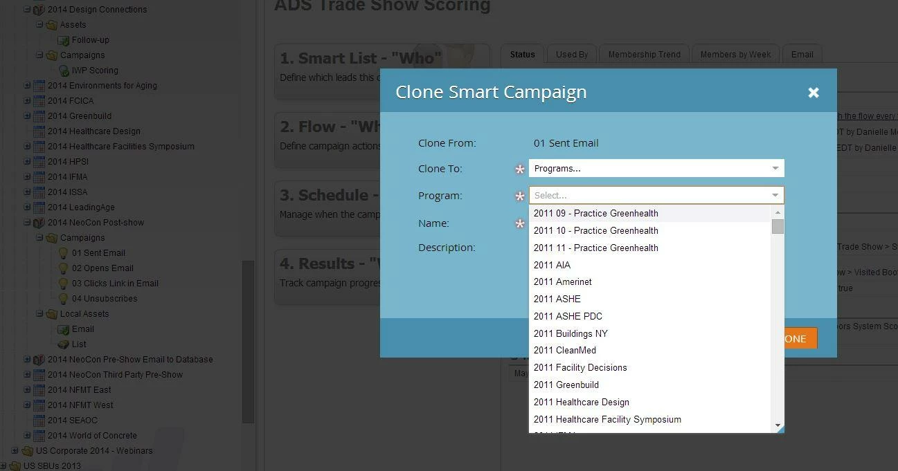 I was attempting to clone a smart campaign within the program to the left called "2014 NeoCon Post Show" when I took the screenshot.