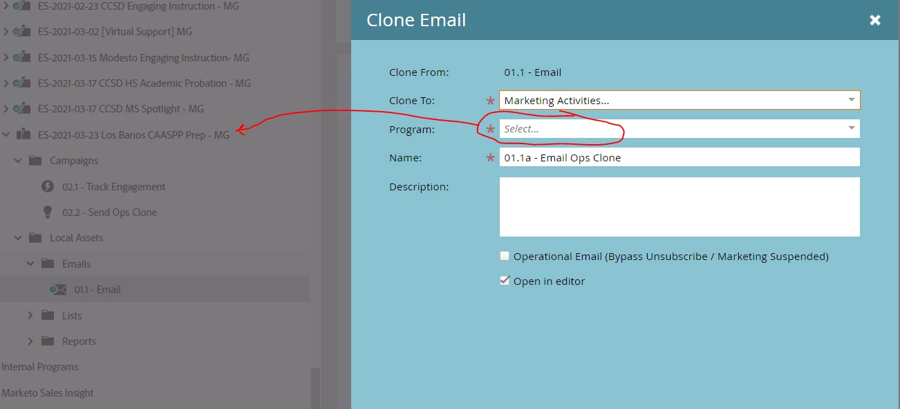 When I try to clone an email this morning, it will not recognize the program I want to clone too.