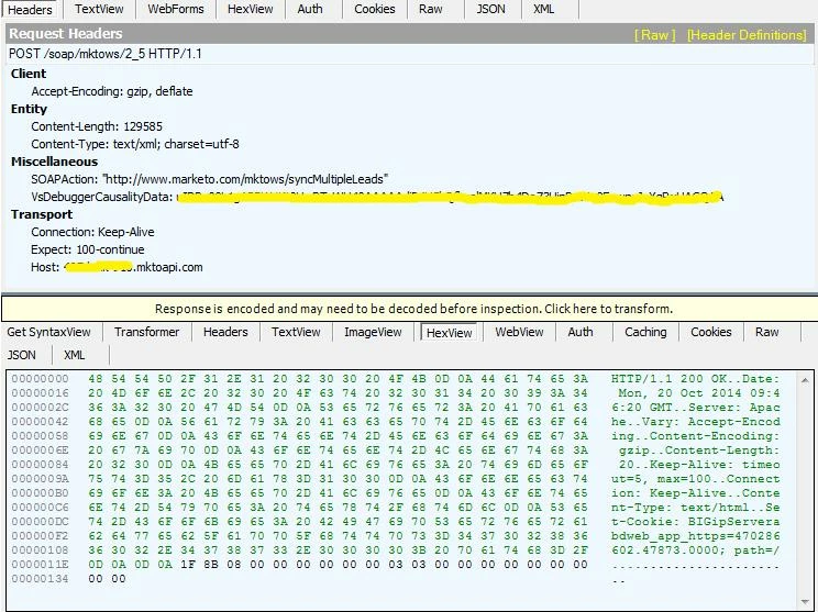 When syncing Leads to Marketo by API SyncMultipleLeads, I get exception with message 'The content type text/html of the response message does not match the content type of the binding (text/xml; charset=utf-8). If using a custom encoder, be sure that the IsContentTypeSupported method is implemented properly. The first 0 bytes of the response were: ''.'