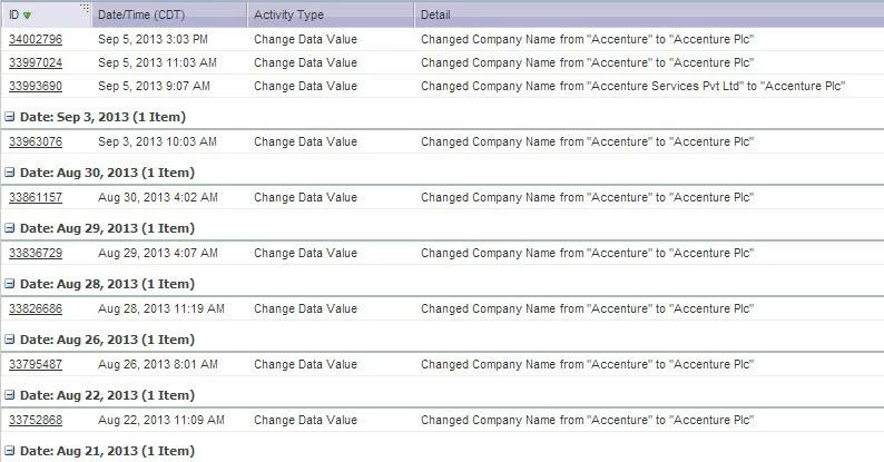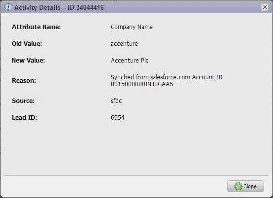 We’ve continuously had this issue where Marketo keeps changing the company name field in our database. For example, say a lead is from Accenture. The correct account name in SFDC is "Accenture Plc." That field is almost never correct in Marketo. It rotates through all the different versions of the name that has been entered into our system through forms, list uploads, etc. Sometimes it reads “Accenture” and sometimes “accenture.” In the activity log, it shows that whenever Marketo is synced with SFDC, it keeps trying to change it back to "Accenture Plc." See image below.