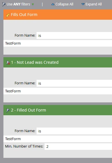 But what if the lead was created by this form in the past? That's why we need the Filled Out Form filter with constraint Form Name = the same form as the trigger, and Min. Number of Times = 2. The first fill being their past fill and the second+ one being this specific fill.