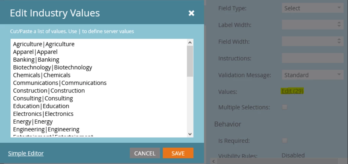 I currently have two forms with the same field "Industry" however each form needs a different set of values for different use cases. I understand that if I add new picklist values to the Industry field in SFDC then the existing form will not be updated with the new values, only forms approved after that point.