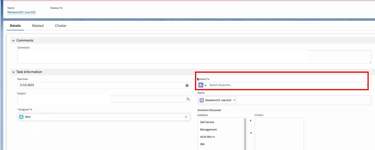 We created a task in Marketo to write back to Salesforce where a planner/owner is assigned a task but the field "Related to" as you can see in the screenshot below is empty.