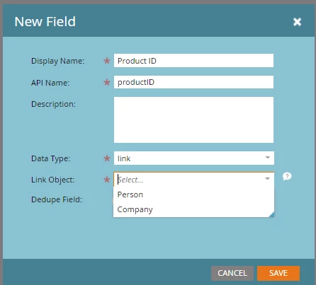 Custom Object 2: This will link to Custom Object 1 using Product ID, but I'm not able to see custom object 1 in the link object drop down. Only options I can see are Person and Company.