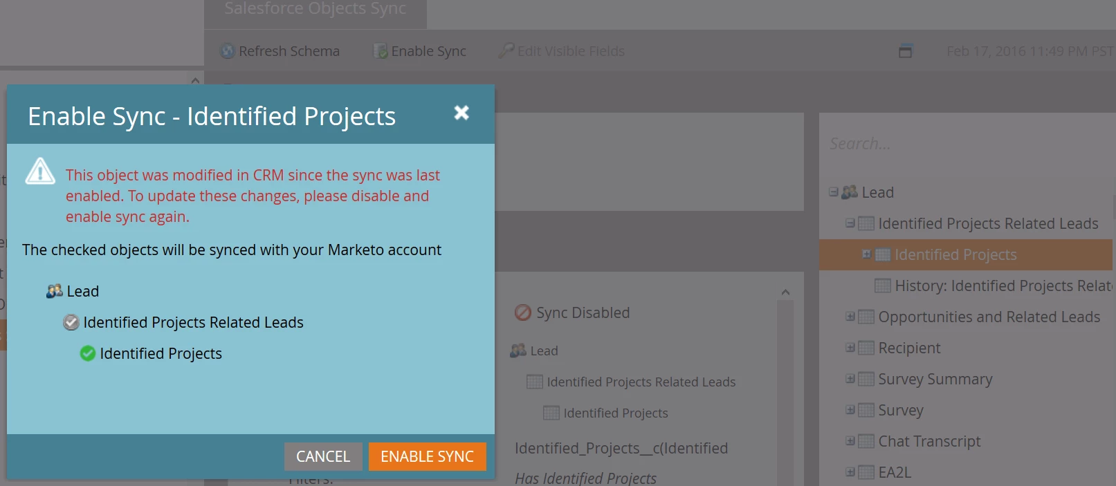 We are trying to sync a custom object related to Lead and contact. the sync with Custom Object related to contact worked well , but the sync with lead is showing up error ""The Object was modified In CRM since the sync was last enabled..." the process followed was as per the standard process (disable global sync> refresh schema> enable sync for custom object). not sure why this error is coming up.