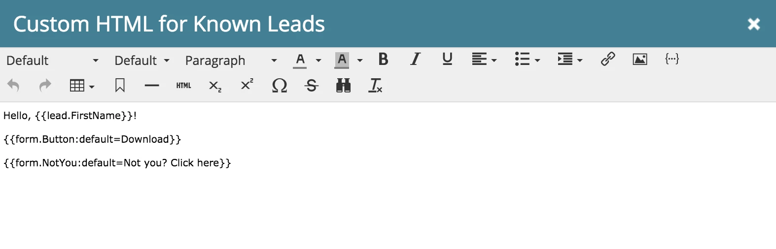 Under form, when the user is known, we would like the custom HTML to include lead first name in the link. Like {{form.NotYou:default=Not {{lead.FirstName}}? Click here}}. Since this is token inside token, I am not able to do this. Is there a workaround for this?