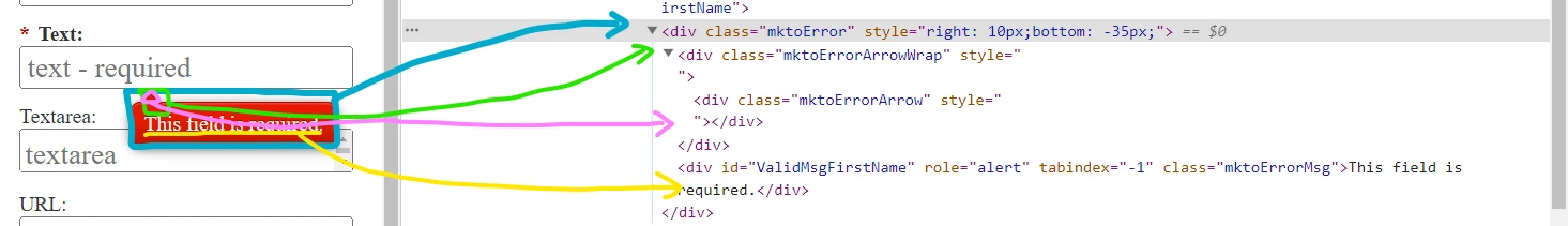3. .mktoForm .mktoError .mktoErrorArrow - this is the actual arrow insdie the ErrorArrowWrap. It's really a box that's rotated 45deg and then clipped at the bottom by the parent wrapper. Try using the form.mktoForm .mktoError .mktoErrorArrow selector for you code instead.