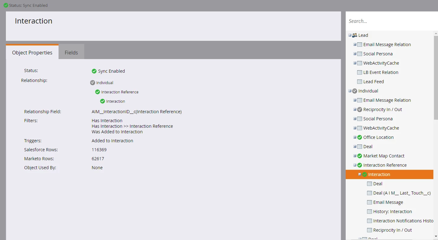 I have successfully pulled through Custom Salesforce objects to Marketo in the past, but I seem to having a problem with one particular object called Interactions.We have quite a customised salesforce and this object records all emails, meetings etc with contacts. It also cross references the Account object. It looks like the below: