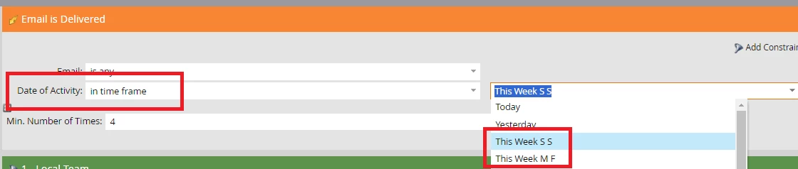 Enable users to personalize specific weekdays within the "in-time frame" constraint. As an illustration, in our email calendar scenario, beginning from Saturday in Week 1 through Friday in Week 2, having the ability to select specific weekdays for filtering or constraints would be beneficial.