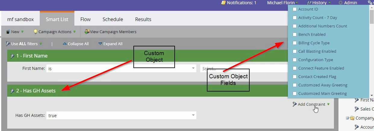 Custom Activity Primary Field: Custom activity fields that can be used as the smart list filter criteria.