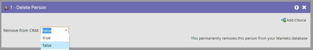 If all leads that are members of this program appeared on the list, you can use the Member of Program filter under the smart list tab. Under the flow step, drag Delete Person down to the stage. Here, you're able to tell Marketo if you want to delete these records from your CRM.