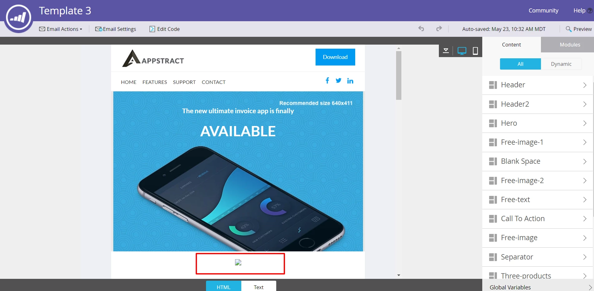 When I attempt to add an image from our Design Studio library to a template, it does not actually appear in the email editor. Below is a screenshot, and the red box indicates where the photo should be appearing. Instead I get a broken image icon.