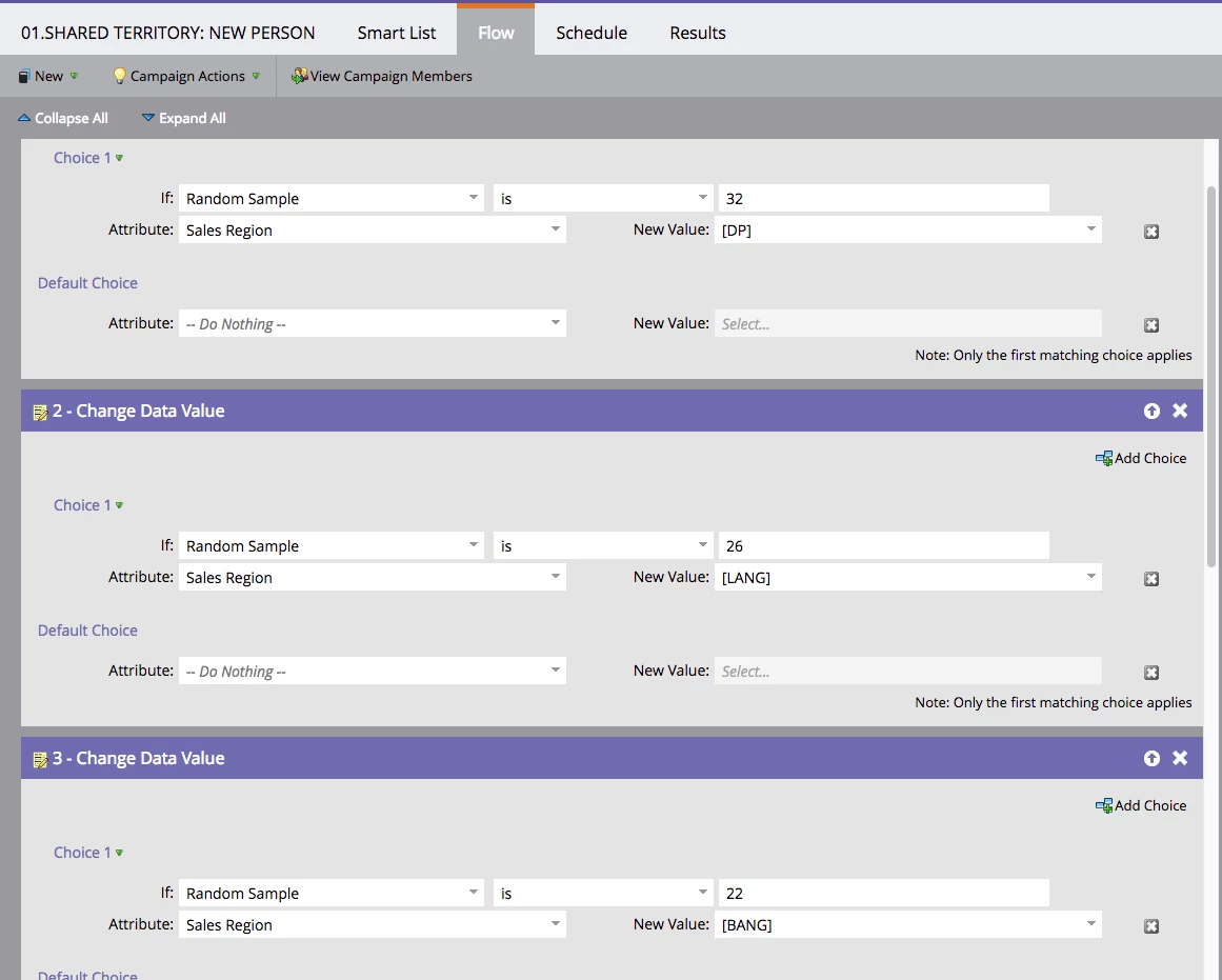 However, I wasn't sure if the random sample flow step would work outside of a batch campaign with a static list because that's the only way I've seen it referenced in other discussions, in which case I would imagine the way it would need to be set up would be that I'd have a smart campaign listening for when new people are created in this shared sales territory, with a flow step to add them to a new static list. Then, I'd have a second smart campaign set up with a trigger "Is Added to List" and the flow steps set up with the random sample as established above.