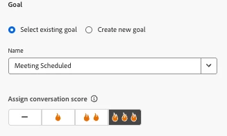 By assigning a conversation score (0–3) to each goal, you can better align lead actions with your lifecycle strategy and determine the next best step. To add a conversation score to a dialogue select a goal and assign the conversation score from 0 - 3 flames.