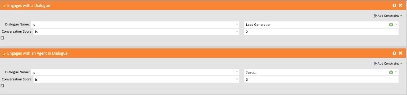 Adding conversation scores to your dialogues enhances both demographic and behavioral scoring models through filters or trigger constraints natively integrated into your Marketo instance. This allows you to: