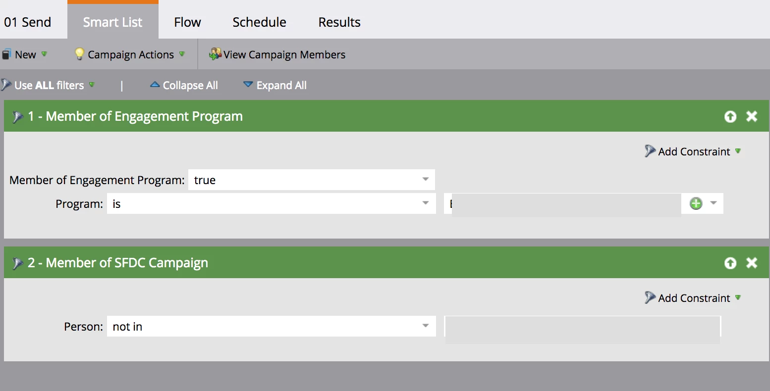 The send is slightly complex. I ran a drip and nurture for this particular audience that we are sending this out to. so I set it up so that anyone in the engagement program would receive it and anyone who has already registered in the SFDC campaign wouldn't receive an invite since they would have registered for that event.