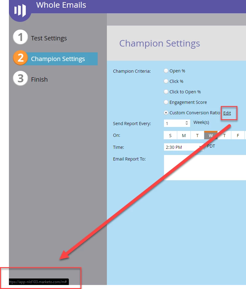 I was trying to test some emails with the Champion/Challengers, however, when I tried to define the Custom Conversion Ratio, or especially when clicking the "Edit" button shown in the screenshot below, it does not open a pop-up window that's supposed to come up. Also, If you look at on the bottom left corner of the screenshot, it looks like the URL is empty, has anyone encountered this issue before?