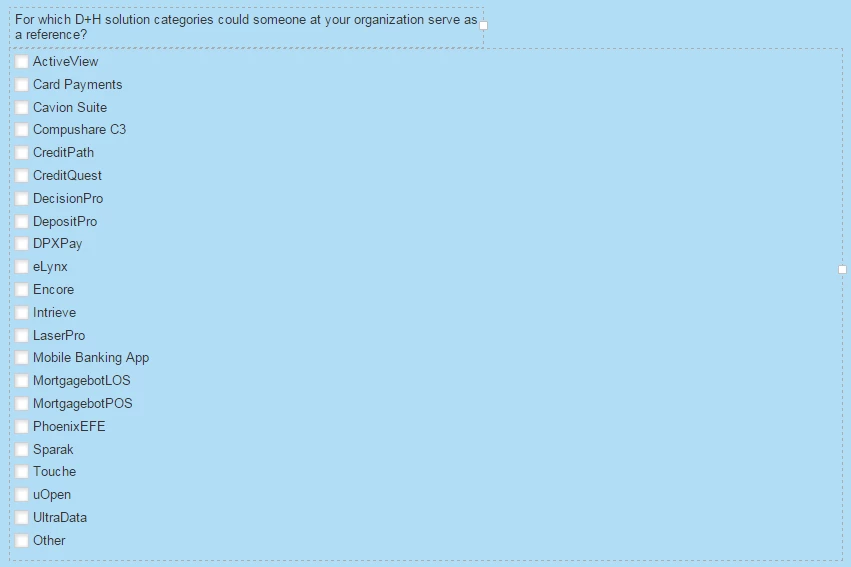 I have a form with a really long list of product values. The field type is set to be a check-box (see below).