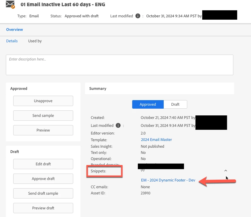 @amyvoigt_pbc It's common practice to include snippets in the footer. However, since there are no snippets currently, you might want to check if you have tokens in your email footer. You can check for tokens from the token tab in the email program or from the email draft.