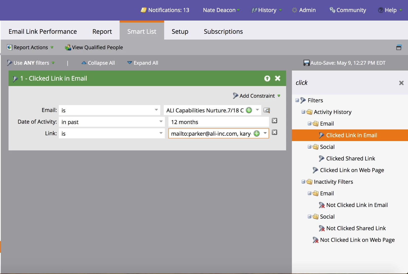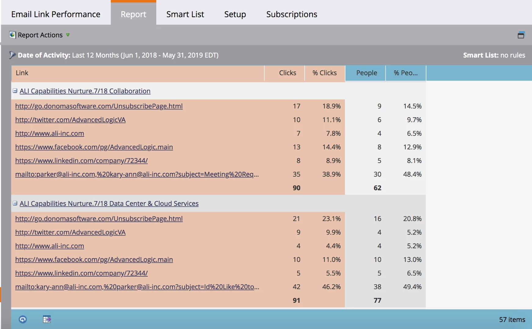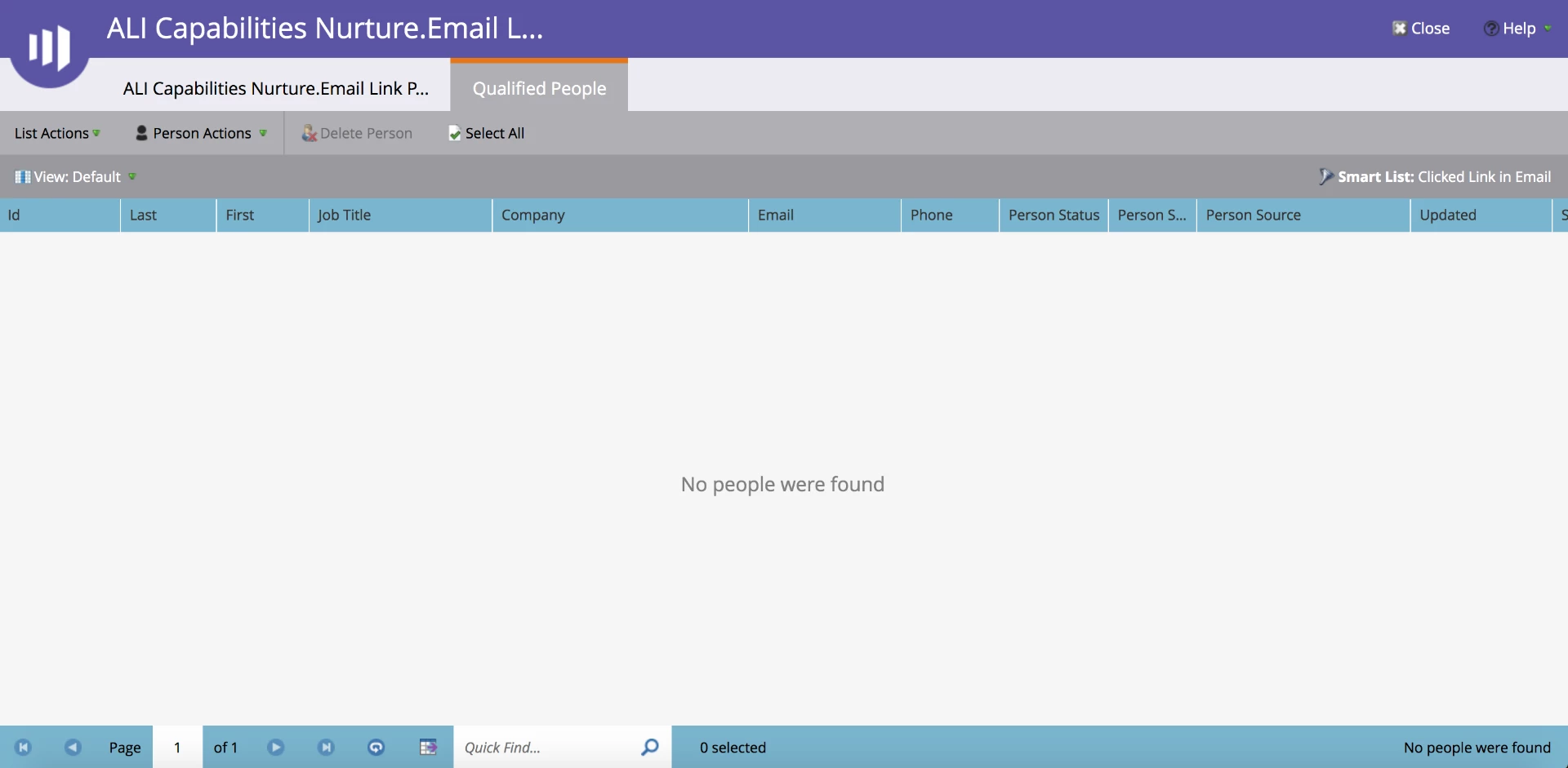 My email link performance report is telling me that I had 30 people click (see image below) on the "mailto:parker@ali-inc" link in the past 12 months. When I build my Smart List so I can see who specifically clicked on the link, and then click View Qualified People, no names/contacts show up. Am I doing something wrong? Can someone explain this for me?