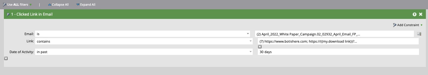 I noticed that in the results section of our emails smart campaign, clicks show up correctly and give the information of what link was clicked. But when I want to filter down in a separate smart campaign using this smart list : Clicked Link in email, A, B. Link is A. The person does not appear in the list.
