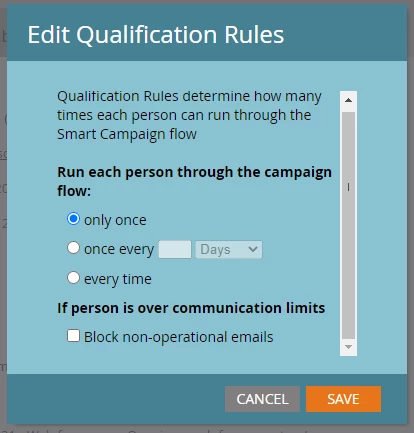 I think you may not need this for this campaign in particular, but just FYR: there's an another option in this dialog to let people filling out the form run through this campaign "once every x hours/days/months , etc." - example, if you choose once every 2 days, the qualifying person will flow through the campaign only once every 2 days - even if the person qualifies for the campaign more than once in this timeframe unlike the "every time" option, where-in the person flows through the campaign every time they qualify for it. Hope you find this helpful, happy to answer any questions you have in this regard.