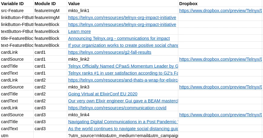 Once the marketing operations team has the email content in a structured way within the “Month YYYY” tab then we can map each of the content sections, whether text, destination url, or dropbox image link, to their corresponding email variables within the email template using the “Back End” tab.