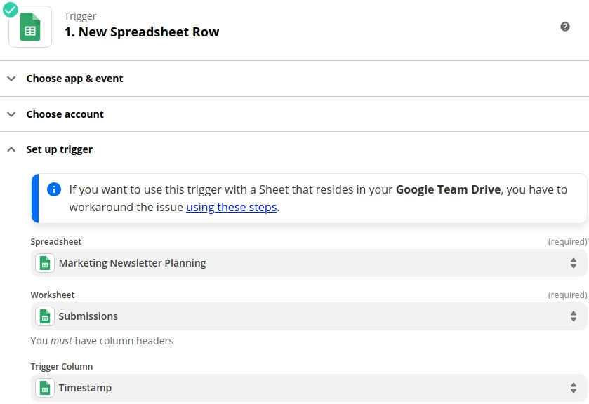 1. Once the new row has been created in the “Submissions” tab, this will trigger the “New Spreadsheet Row” trigger in Zapier and then cause the 11 subsequent “Code by Zapier” Python actions to run in succession.