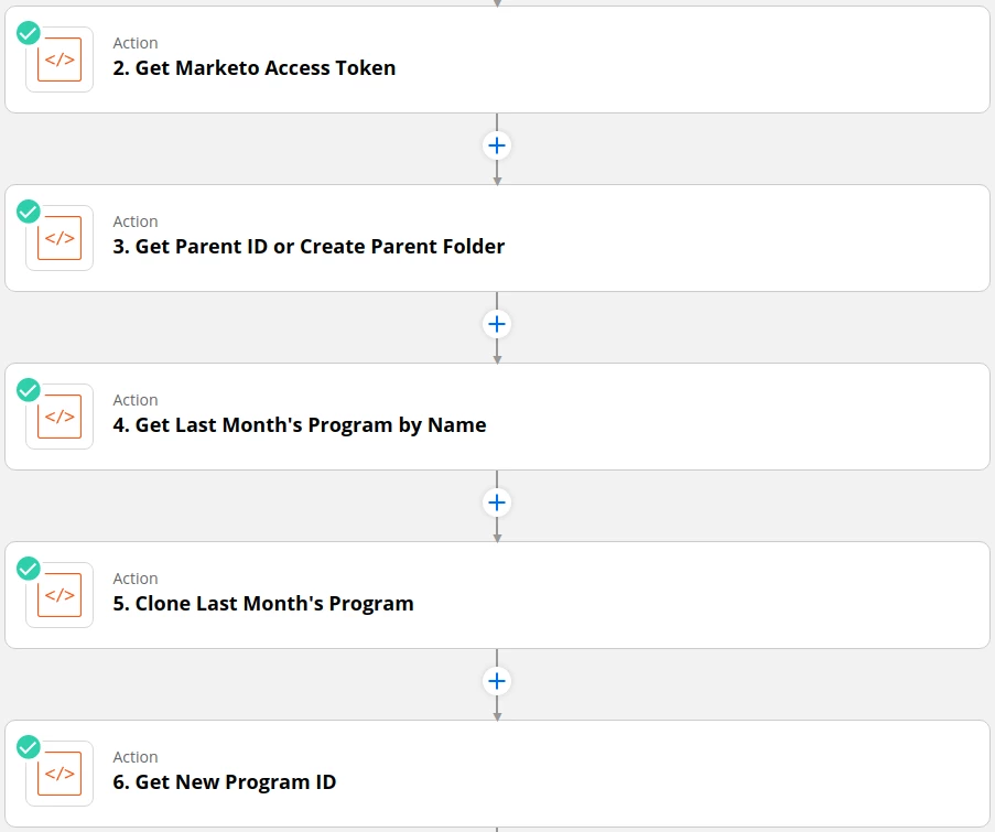 6. While the API request to clone a program does return the ID of the new program (step 5), I found that while the step succeeded to create the new program it often did not send the successful response to Zapier within 10 seconds. Since Zapier has a 10 second timeout limit on all actions this meant that Step 5 would be marked as failed and all the subsequent steps in the zap that need the program id failed.