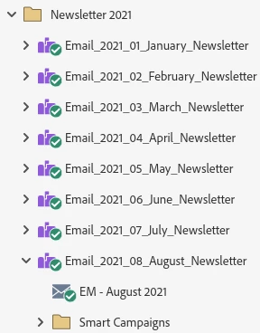 Et Voilà! Once all the API requests have been made, you will have a new email program created in your yearly newsletters folder with an email asset that has been populated with all the content from the Google Sheet.