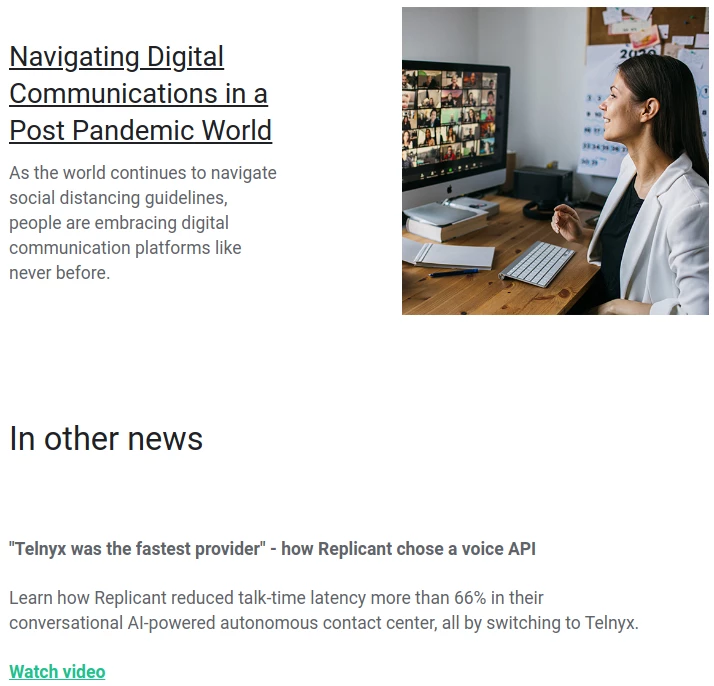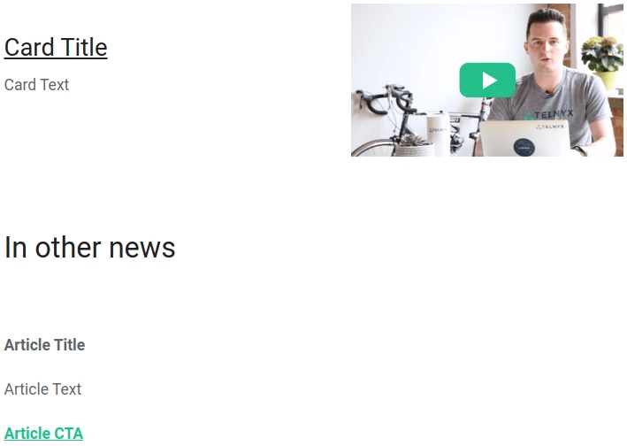 In this newsletter example the “Lead Content”, “Card 1”, “Card 2”, and “Card 3” sections are the same for each customer but the two “Other News” sections are dynamic and will show the customer either SIP Trunking (SIP), SMS, or Call Control (CC) content depending on which segment they are in.