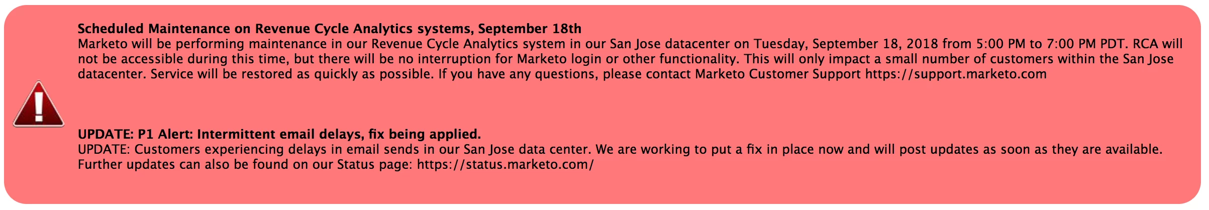 There is currently a P1 for Marketo's San Jose datacenter - intermittent email delays. There is a notice posted in the Support area: Support