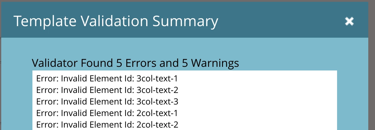 First time posting here so please let me know if this isn't the right place. I'm looking to get some assistance with an "Invalid Element Id" error on an email template I'm working on.