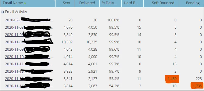 I noticed that last 2 emails we are seeing a low deliverability rate and almost half of them are being soft bounced or in "pending" status when I looked at the email performance report.