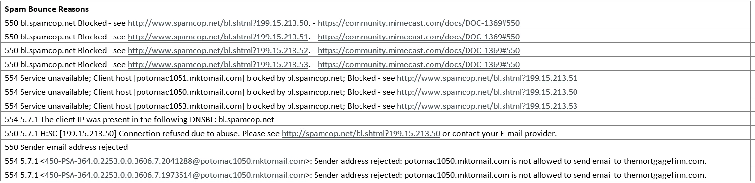 Emails to some clients are bouncing. The message we receive is: "554 Service unavailable; Client host [potomac1050.mktomail.com] blocked by bl.spamcop.net; Blocked - see http://www.spamcop.net/bl.shtml?199.15.213.50" to "554 Service unavailable; Client host [potomac1053.mktomail.com] blocked by bl.spamcop.net; Blocked - see http://www.spamcop.net/bl.shtml?199.15.213.53"