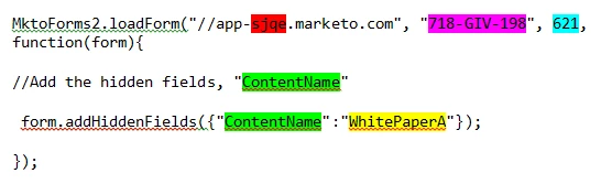 - On the webpage that hosts the form, add a customized version of this code, so that when the form is loaded, you add a hidden field (highlighted in green) and pass a value into it to indicate which piece of content was retrieved (highlighted in yellow). Be sure to customize the code with your pod (highlighted in red), your account string (highlighted in purple) and the form ID (highlighted in blue).