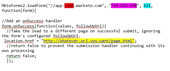 - On the webpage that hosts the form, add a customized version of this code, so that when the form is submitted, it redirects to the URL highlighted in yellow. Be sure to customize the code with your pod (highlighted in red), your account string (highlighted in purple) and the form ID (highlighted in blue).