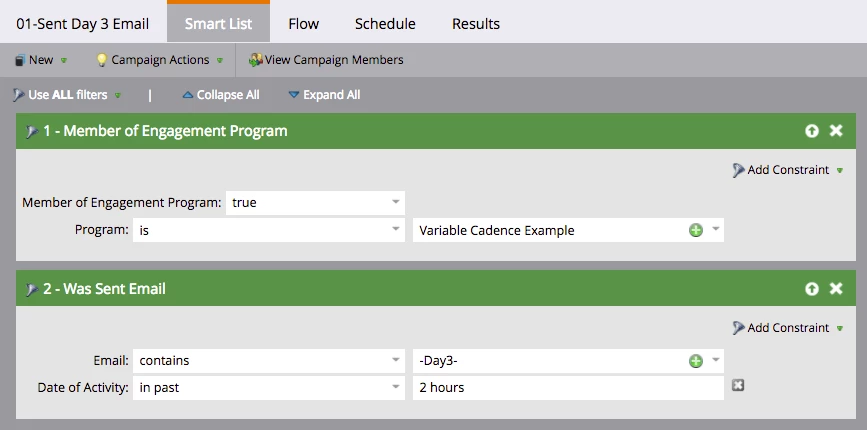 Every batch campaign for maintaining cadence will be scheduled to recur daily at the same time. In this case, every cast is scheduled for 10 am and the batch campaigns run at 11 am (after). The Smart Lists specify the email (e.g. -Day3-) delivered in the past 2 hours, so this will ensure the right batch campaign runs.
