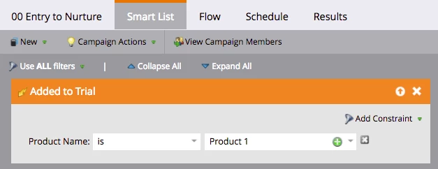 In the example above, a Custom Object has been added for Trials and the trigger for entry to Stream 1 is being added to a trial for Product 1. This works great if you have an external database that confirms a new trial and is scheduled to import daily at a specific time to Marketo.