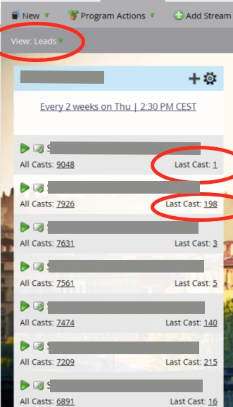 the "lead" view of the stream will tell you how many leads were sent each content at last cast: