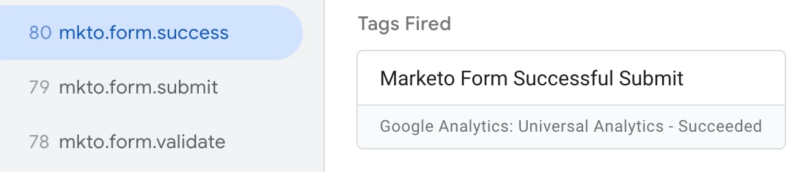 I can see the Marketo Form Listener & Marketo Successful Submit tags being fired when they are supposed to be, so it seems like things on the GTM side are working as expected.