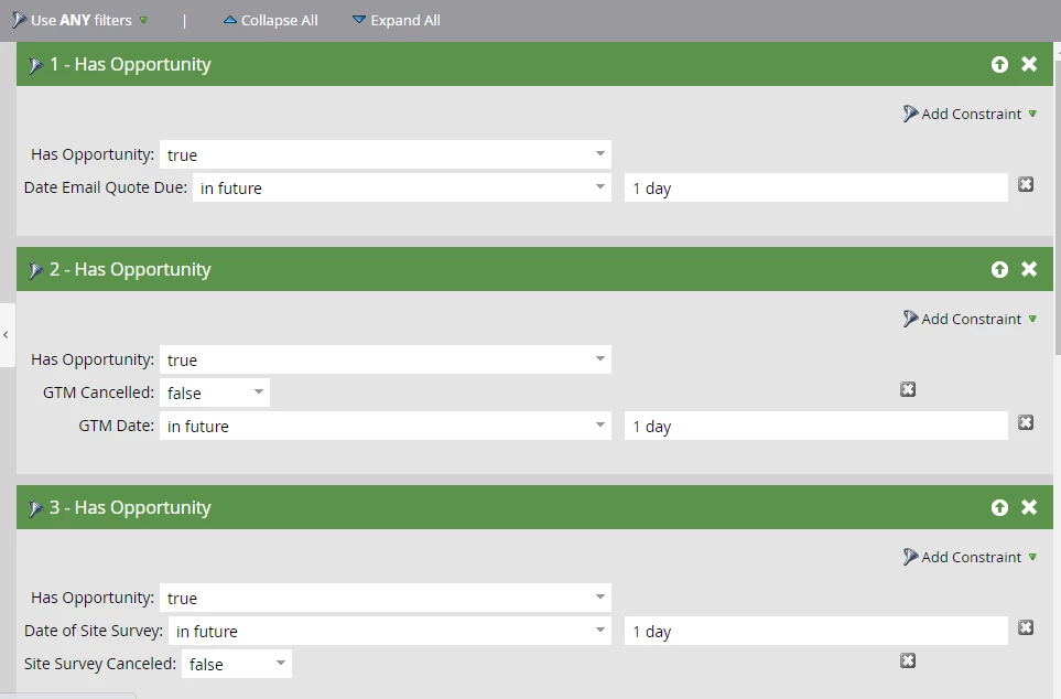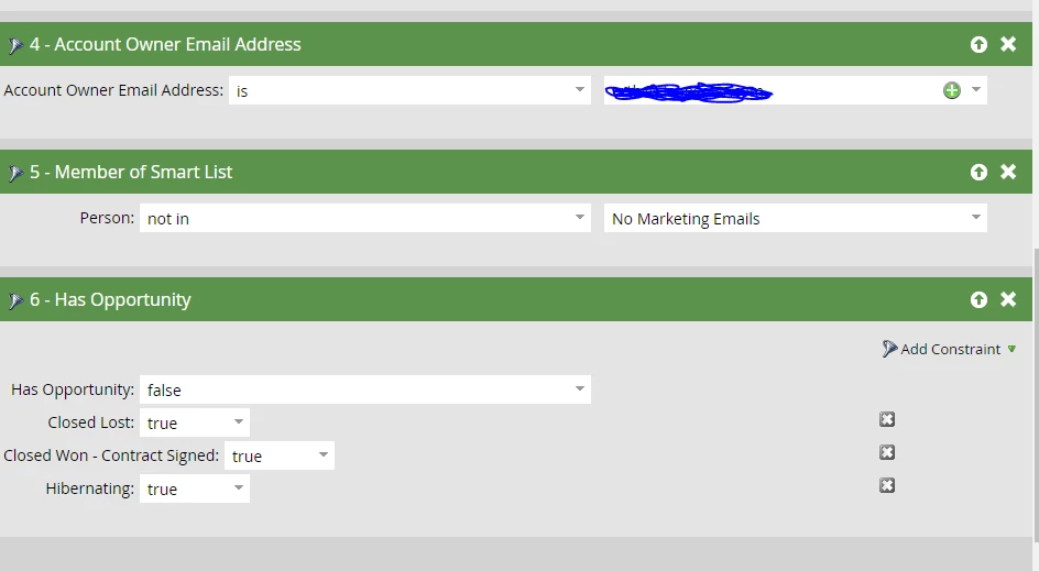 In the second picture attached you can see that we have "has opportunity" as false with constraints, closed lost/closed won and hibernating as we do not want to include those yet they're still on the "people" list.